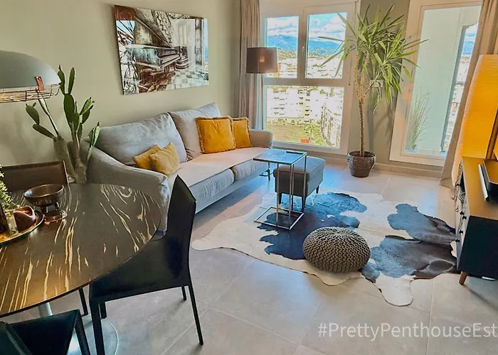 The 80 m^2 #Prettypenthouseestepona includes a terrace and is situated 7 minutes' walk from Galeria de Arte STOA. Offering access to a seasonal outdoor swimming pool, this 2-bedroom apartment is only a short distance from Puerto Deportivo de Estepona Marina.